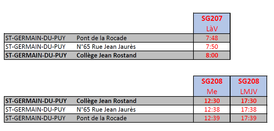 SG205 / SG206 et SG207/208 : ces deux circuits scolaires desservent Fenestrelay pour Saint-Germain-du-Puy aux horaires suivants :