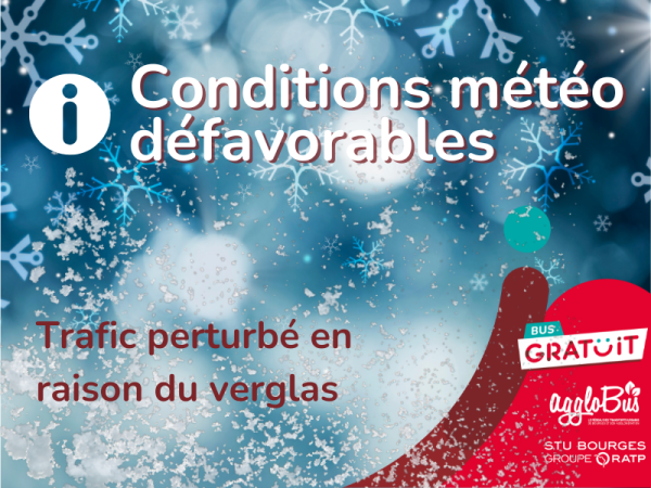 CONDITIONS MÉTÉO DÉFAVORABLES Publié le 03/01/2026 Le réseau // CONDITIONS MÉTÉO DÉFAVORABLES // En raison des conditions météo défavorables, le trafic est perturbé. Soyez prudents, les trottoirs sont parfois aussi gelés que les routes.Restez connectés pour une info actualisée !